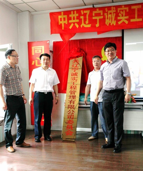 中共抚顺市委组织部领导李劲夫(右二)、中共新抚区委副书记罗玉生(左二)、新抚区委常委组织部长 隋淑贵(右一)、OD手机官方网站入口,OD(中国)董事长赵华(左一)为中共OD手机官方网站入口,OD(中国)委员会揭牌